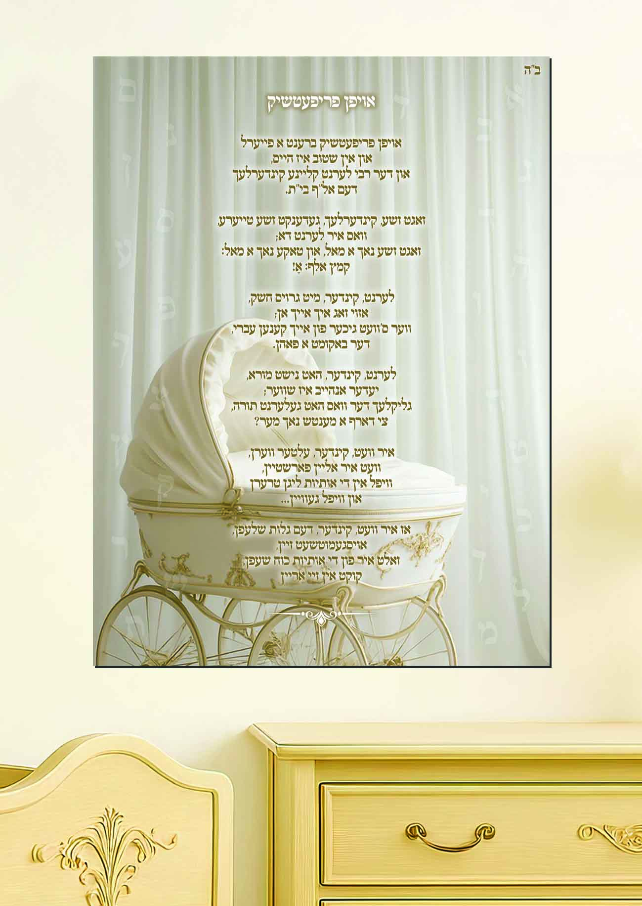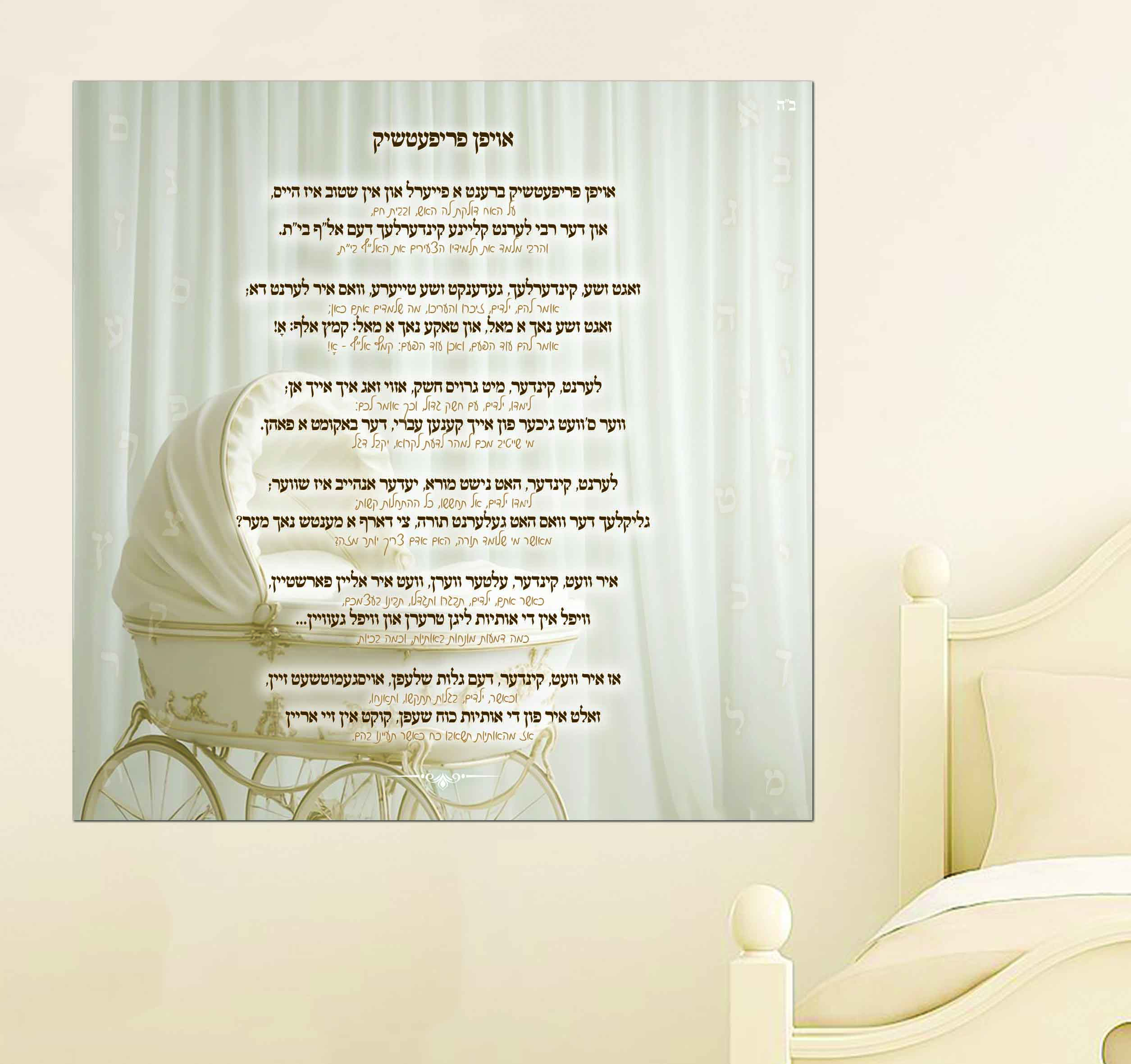 יש יצירות שמעוררות רגש עוד לפני שמתקרבים אליהן. היצירה הזו – “אויפן פריפעטשיק” בעיצוב חדש ומלכותי – משלבת בין יופי קלאסי לעומק יהודי מרגש. הדפסה מרהיבה על עץ מבריק, שבה רקע של וילון רך ועריסת תינוק בגוון בהיר יוצרים אווירה שלווה, טהורה ומלאת רוך. זו יצירה שמכניסה חמימות ועדינות לכל חדר, ומשדרת הוד והדר לצד תמימות וקדושה.