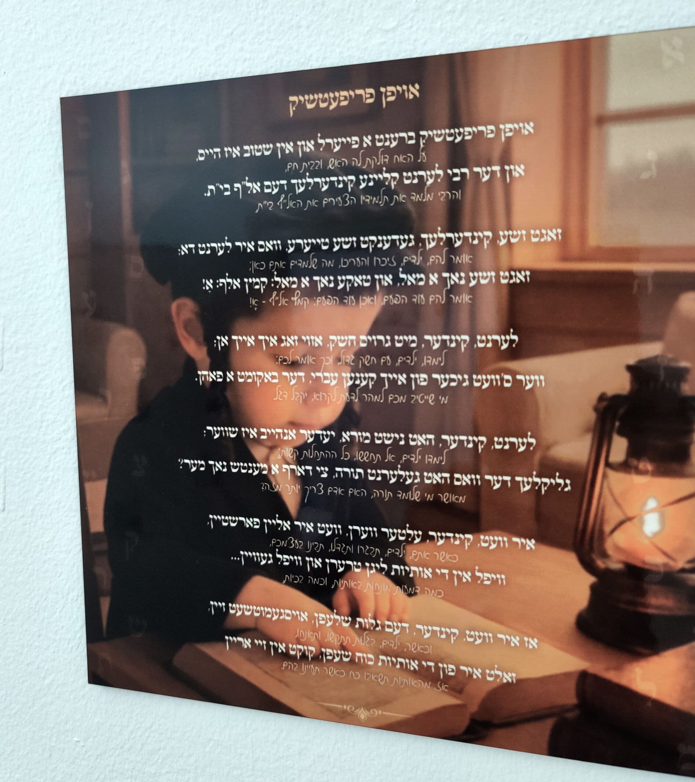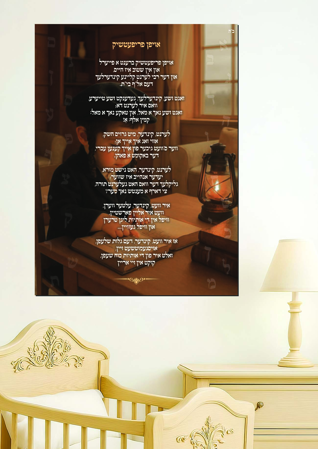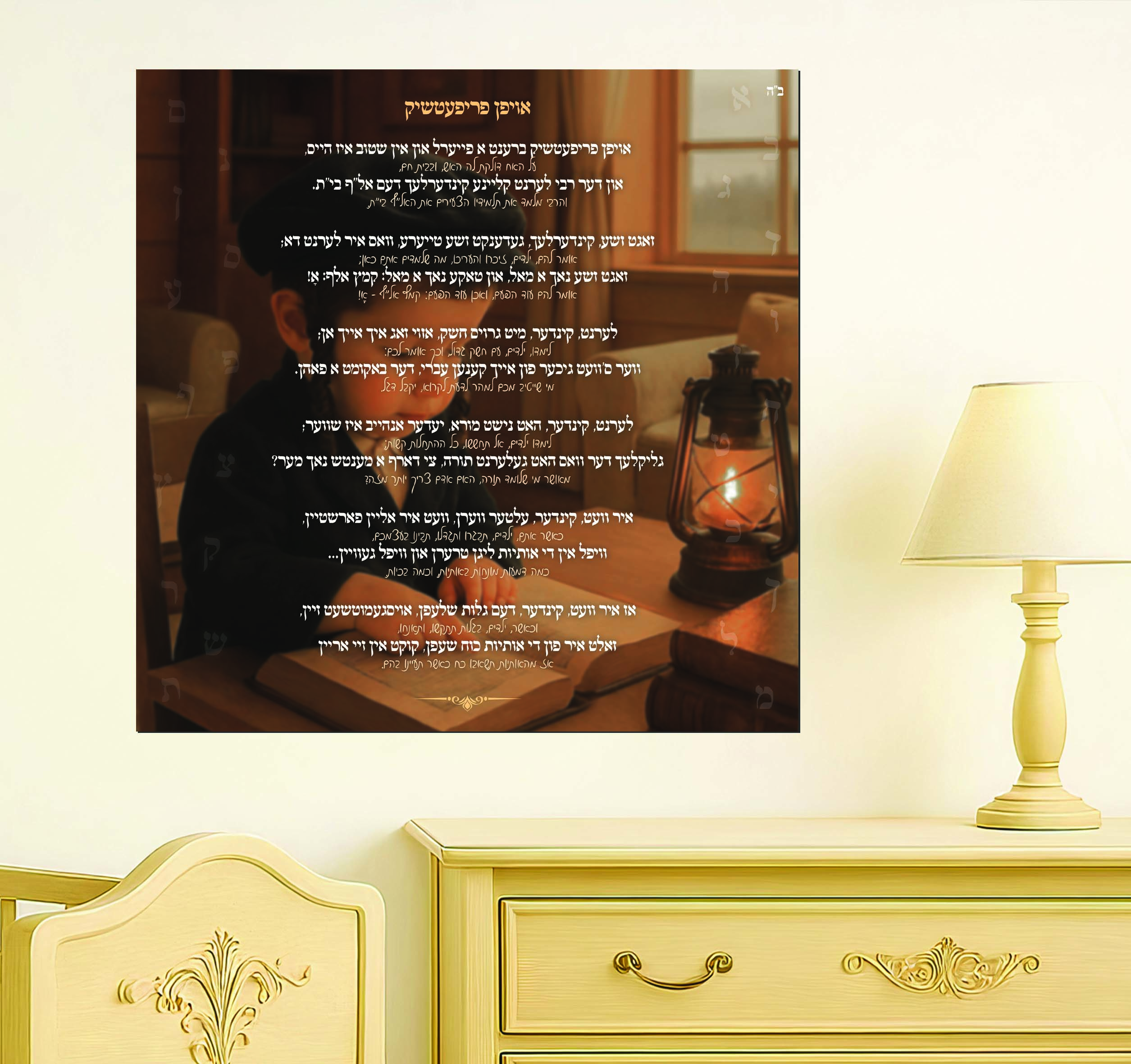 יש יצירות שמספרות סיפור. הדפסה אומנותית זו, בעיצוב חסידי עתיק של השיר האהוב “אויפן פריפעטשיק”, מביאה אל קירות הבית את חמימות הילדות היהודית, את התום ואת אור התורה. התמונה מציגה ילד חסידי היושב ולומד במתיקות את התורה הקדושה – סמל למסירות, לאמונה ולפשטות יהודית טהורה.