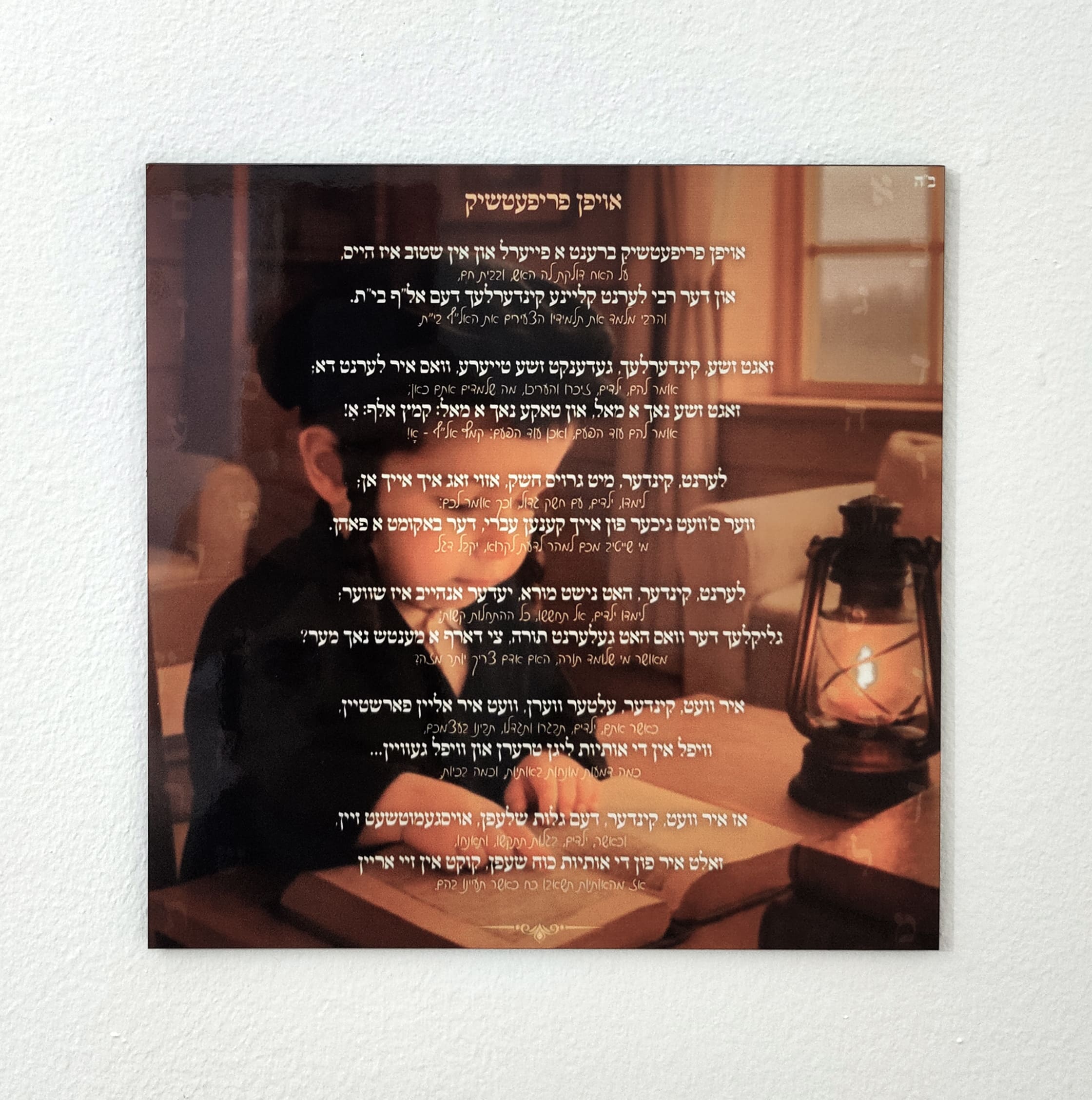 יצירת אמנות ייחודית ומרגשת בעיצוב חסידי עתיק, המתארת ילד חסידי יושב ולומד את התורה הקדושה במתיקות ונעימות – כמו בשיר הנוסטלגי “אויפן פריפעטשיק”.