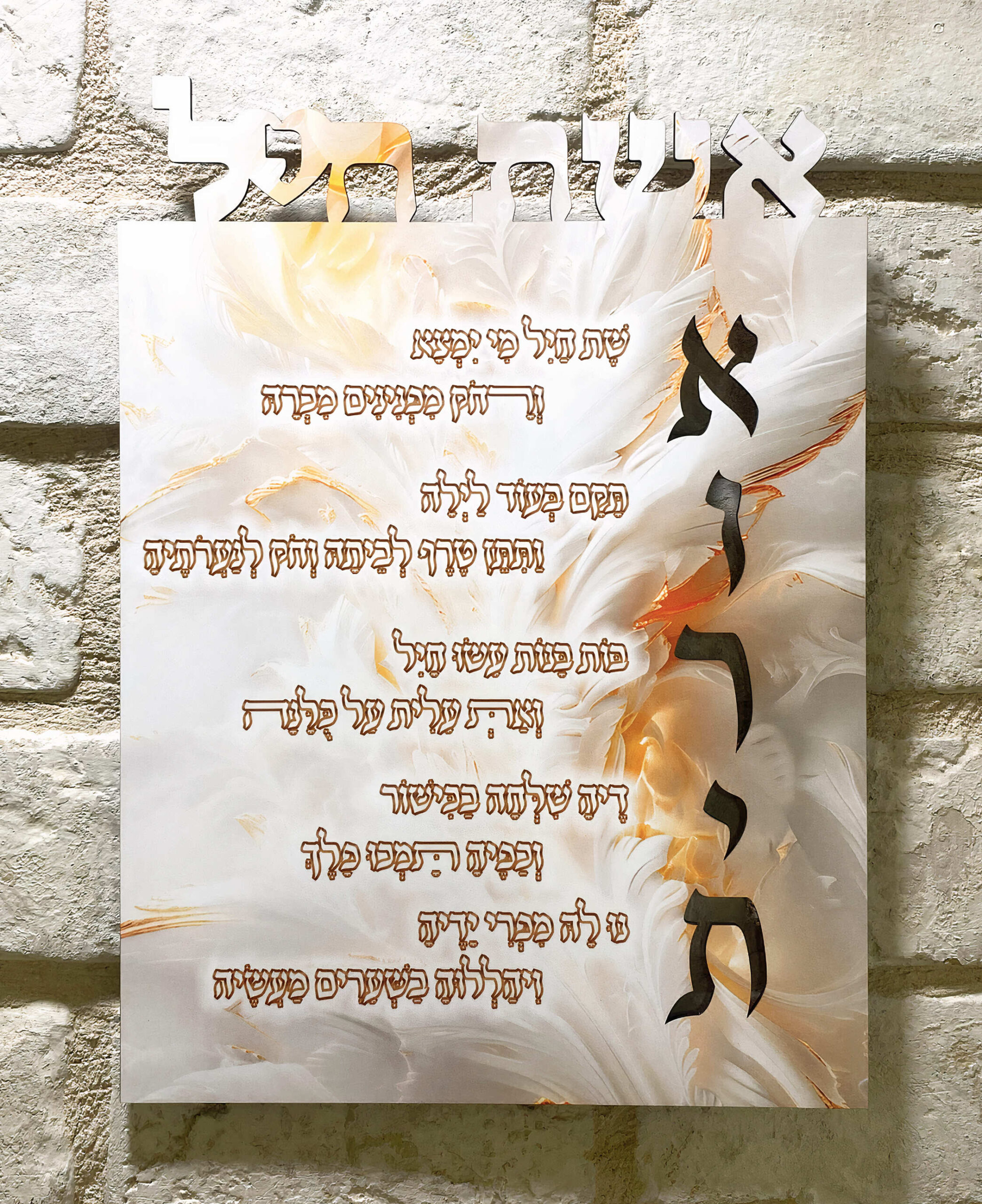 מבריקון עם כיתוב בחיתוך בראש העץ – אשת חיל, עם הדפסה בעיצוב יוקרתי ומגוון סגנונות לבחירה ששם האשת חיל שלכם חתוך בעץ בחיתוך פנימי בצורה מרהיבה וליד כל אות משמה ממשיך הפסוק המתאים מאשת חיל!