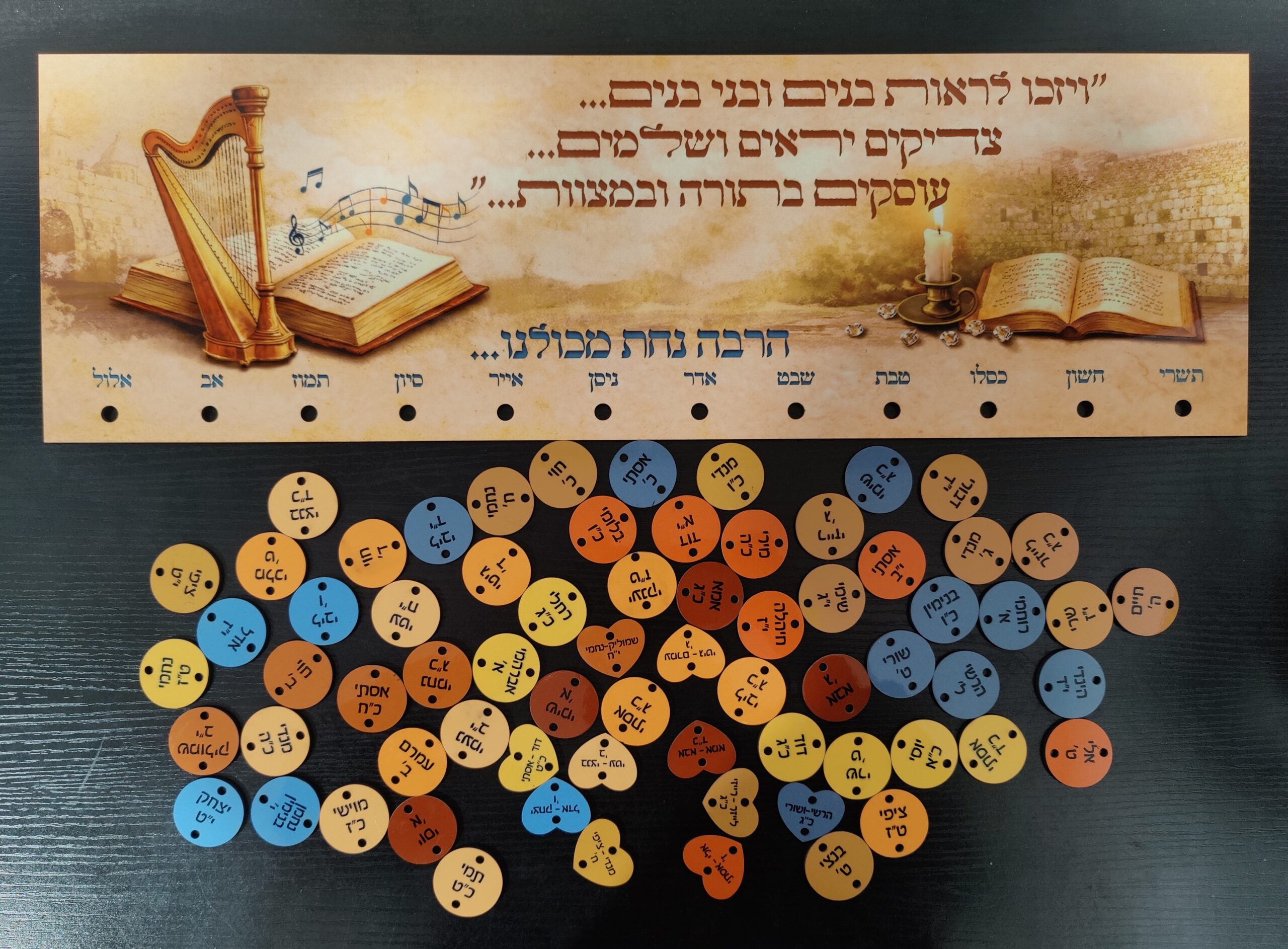 לוח מעץ מבריק איכותי בעיצוב מרהיב עם תליונים בחיתוך מיוחד. בלוח נמצאים 12 החודשים ומכל אחד מהם משתלשלת לה שרשרת של תליונים של כל הילדים, נכדים ונינים עם שם ותאריך לידה בחודש בו הם מופיעים.